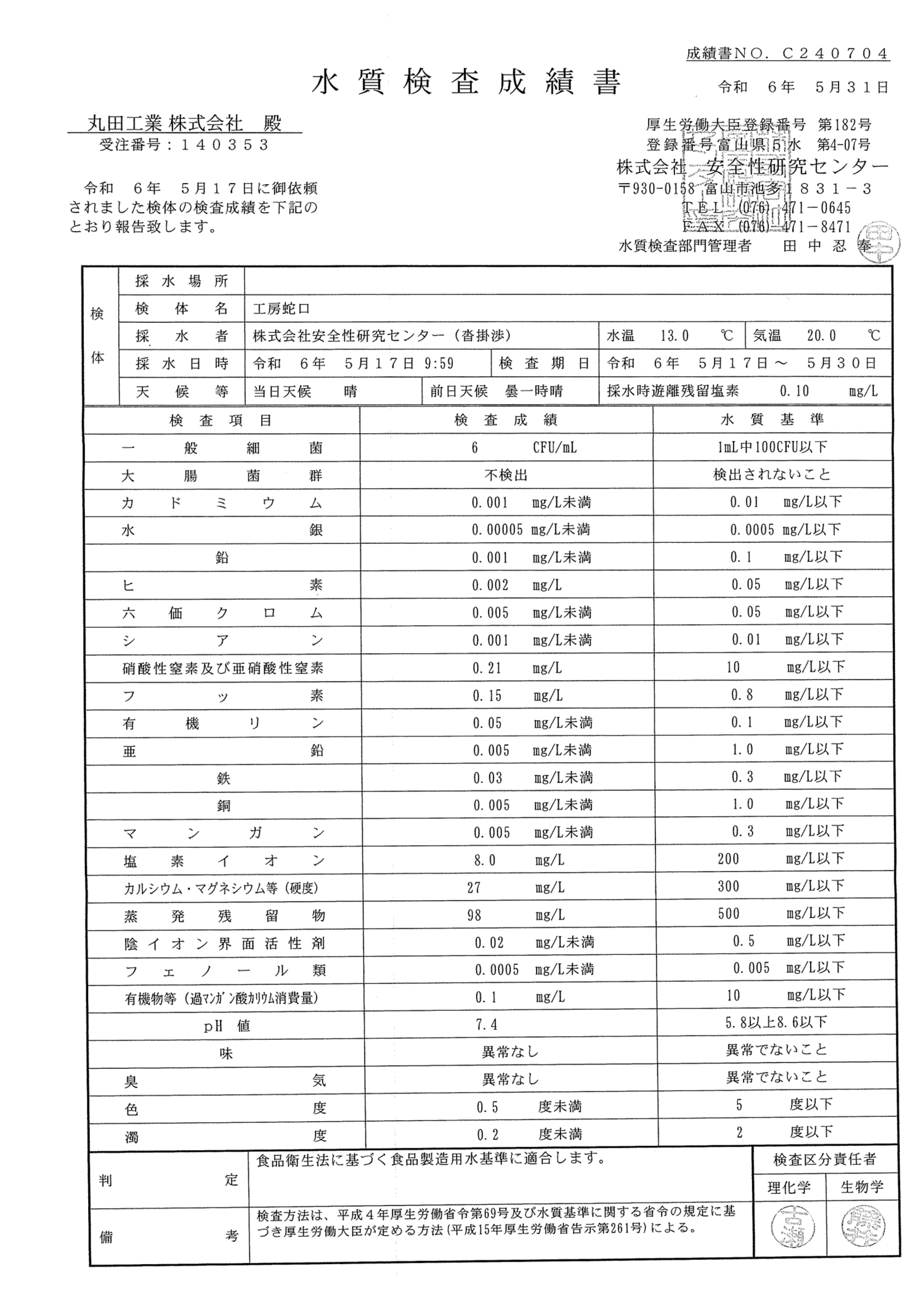 丸田の天然水のpH値は、そのままで約pH7.5。