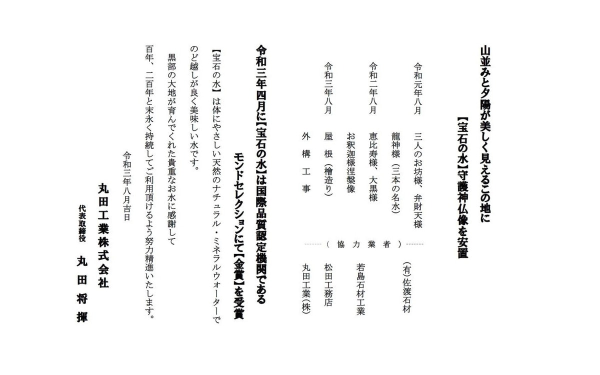 モンドセレクション金賞受賞をした「宝石の水」は1998年4月に自噴をしてから、地下222Mより毎分500ℓの自噴を現在もしております。